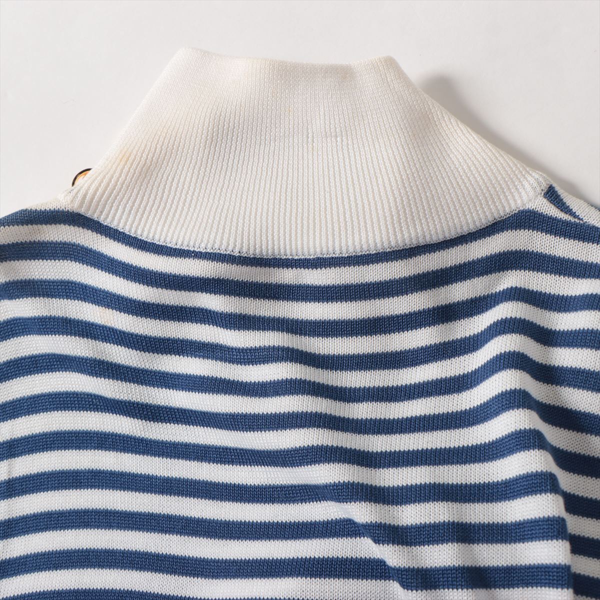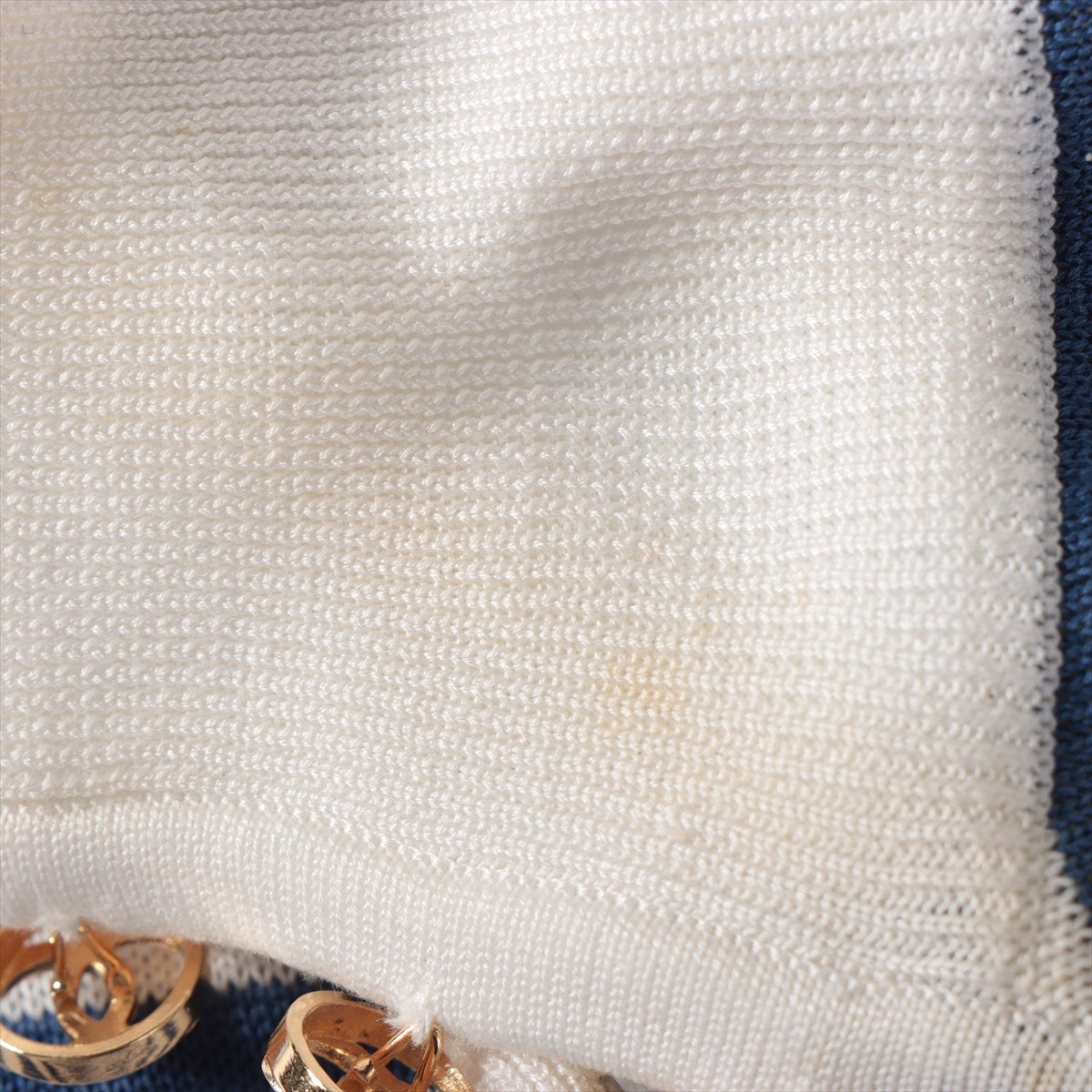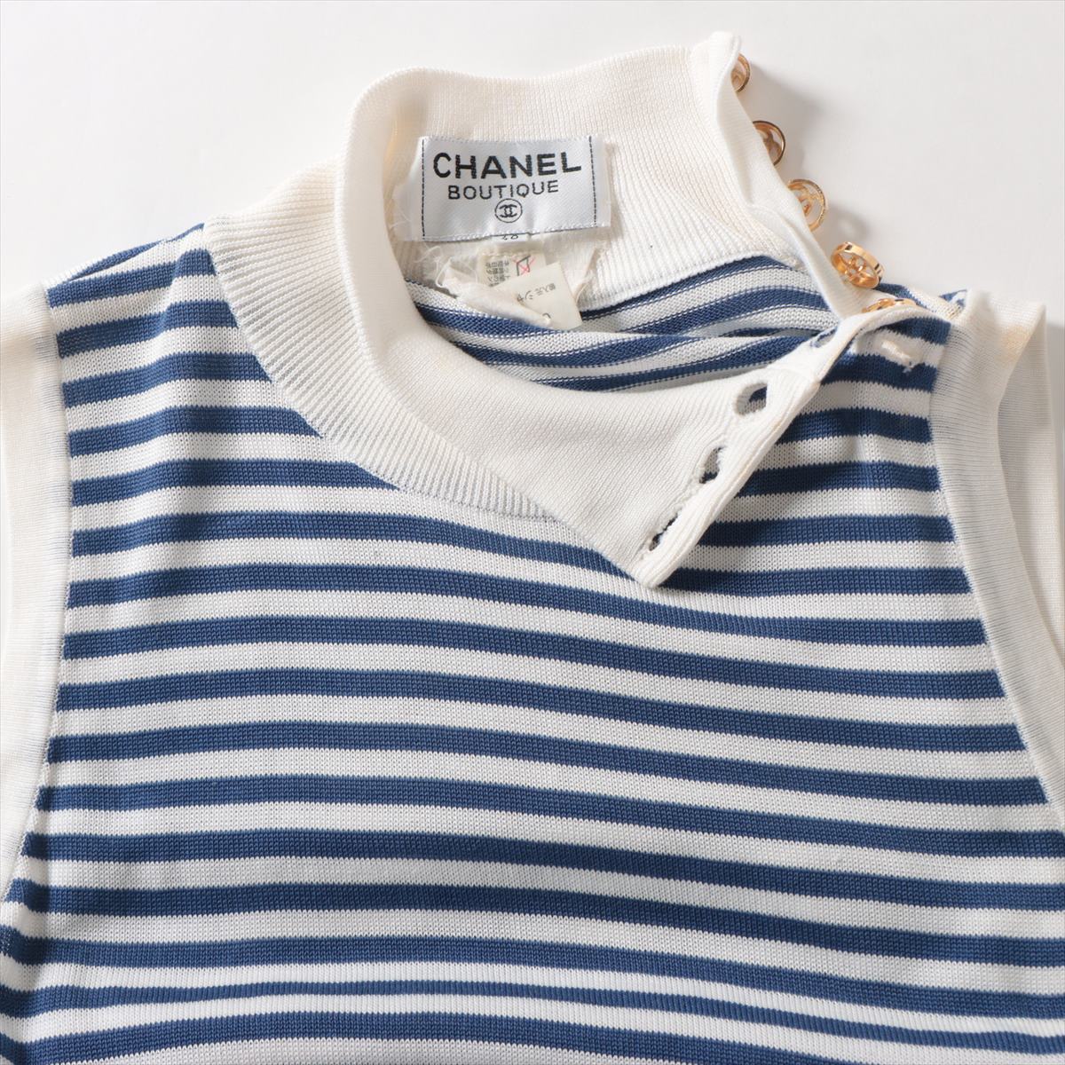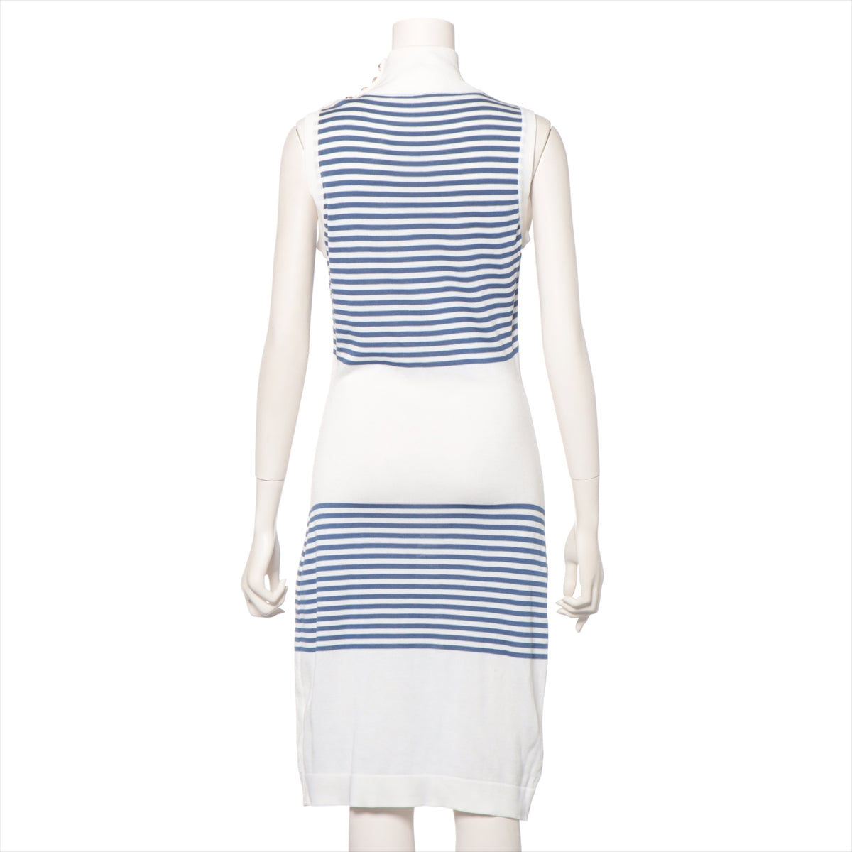 The Chanel Coco Button Turtleneck Knitted Sleeveless Dress in White with Blue Stripes is a timeless expression of elegance and sophistication. Crafted from premium knitted fabric, the dress features a classic turtleneck silhouette and is adorned with Chanel's signature gold-tone CC button on one shoulder, adding a touch of luxury and refinement. The crisp white base is accentuated by delicate blue stripes, evoking a sense of nautical charm and timeless style. With its sleeveless design, it offers both comfort and versatility, making it perfect for various occasions.