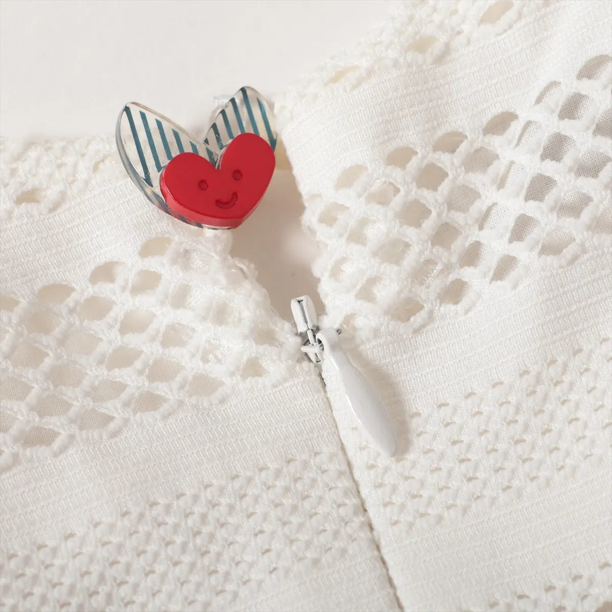 The Christian Dior Cotton Eyelet Ruffle Kids Dress in white is an adorable and elegant piece crafted from soft, breathable cotton with delicate eyelet detailing. Designed with charming front ruffles, it brings a touch of classic Dior femininity to your little one’s wardrobe. The dress is finished with a zipper back closure adorned with a cute heart-shaped button, adding both convenience and a playful touch.