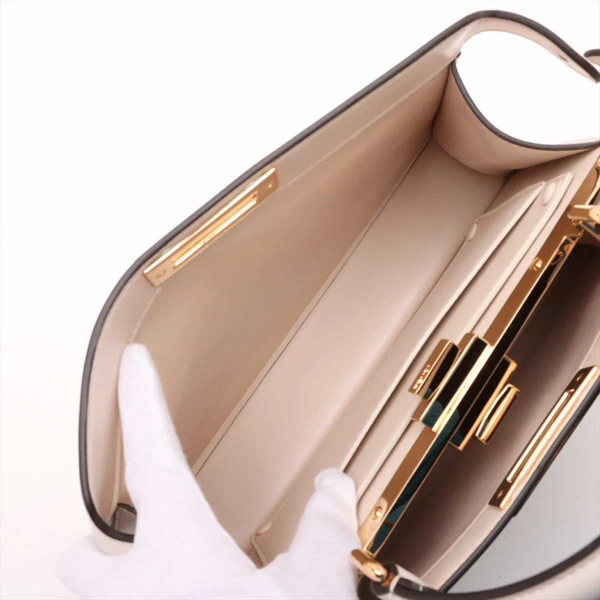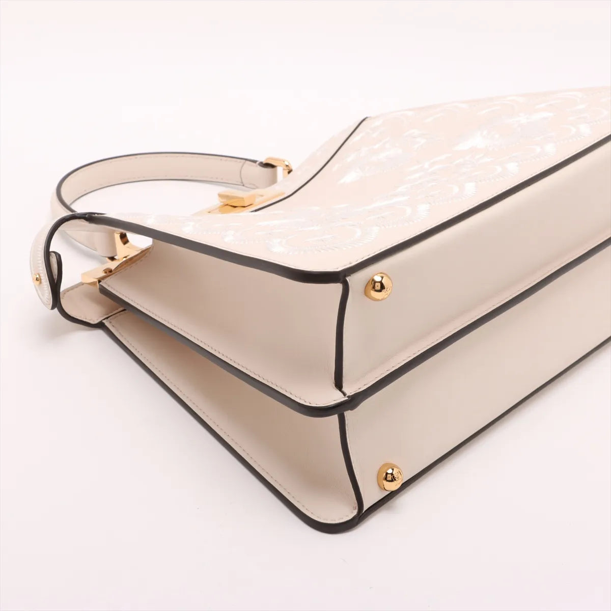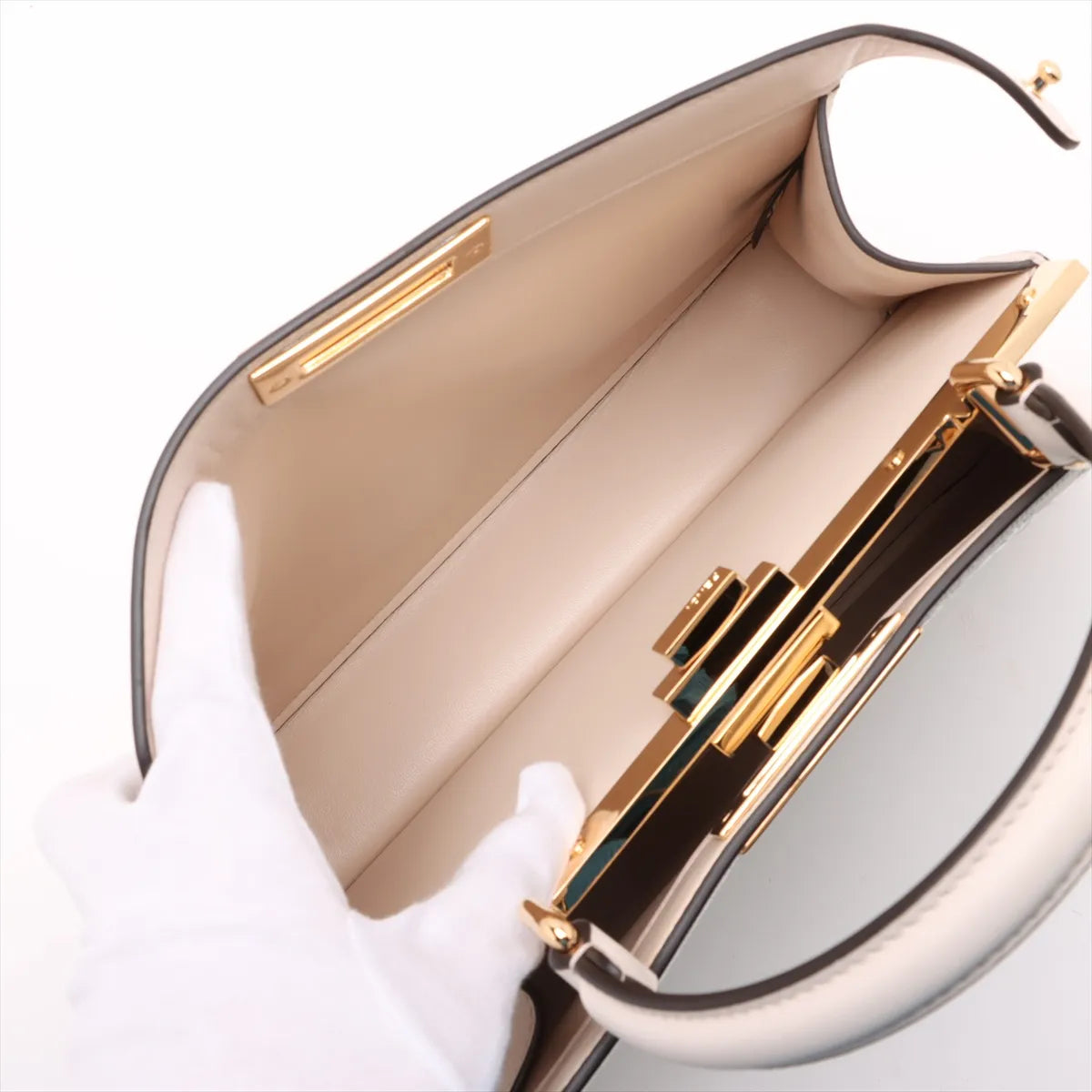 The Fendi Peekaboo ISeeU Medium Leather Embroidery Two-Way Handbag in Beige is a sophisticated statement piece that highlights exceptional craftsmanship and elegant detailing. Crafted from smooth leather, the bag features intricate embroidered floral and scallop motifs that add a refined, feminine touch. The signature twist-lock closure opens to a spacious interior with two divided main compartments, designed for effortless organization, along with a convenient slip pocket.