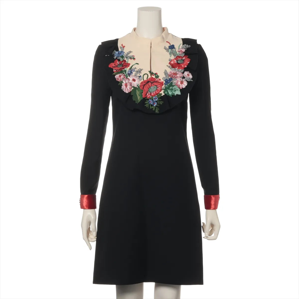 The Gucci Floral Wool Long Sleeve Dress in Black showcases timeless elegance with a vibrant twist. Crafted from luxurious wool, the front is adorned with a striking multicolor floral design that adds dimension and artistic flair. Red accents on the sleeves create a bold contrast, enhancing the dress’s sophisticated silhouette.