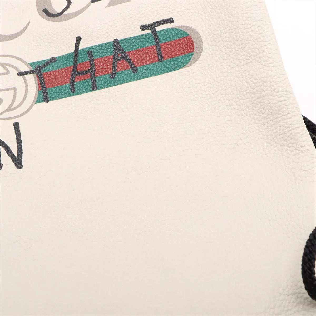 The Gucci GG Logo Drawstring Leather Backpack in white is a bold and stylish piece that captures the brand’s modern creative spirit. Crafted from premium leather, it features the distinctive “COMMON SENSE IS NOT THAT COMMON” graffiti print across the front, paired with the iconic Gucci logo and signature green and red web for an instantly recognizable look. The drawstring closure opens to a spacious interior, offering ample room for daily essentials while maintaining a sleek and contemporary design.
