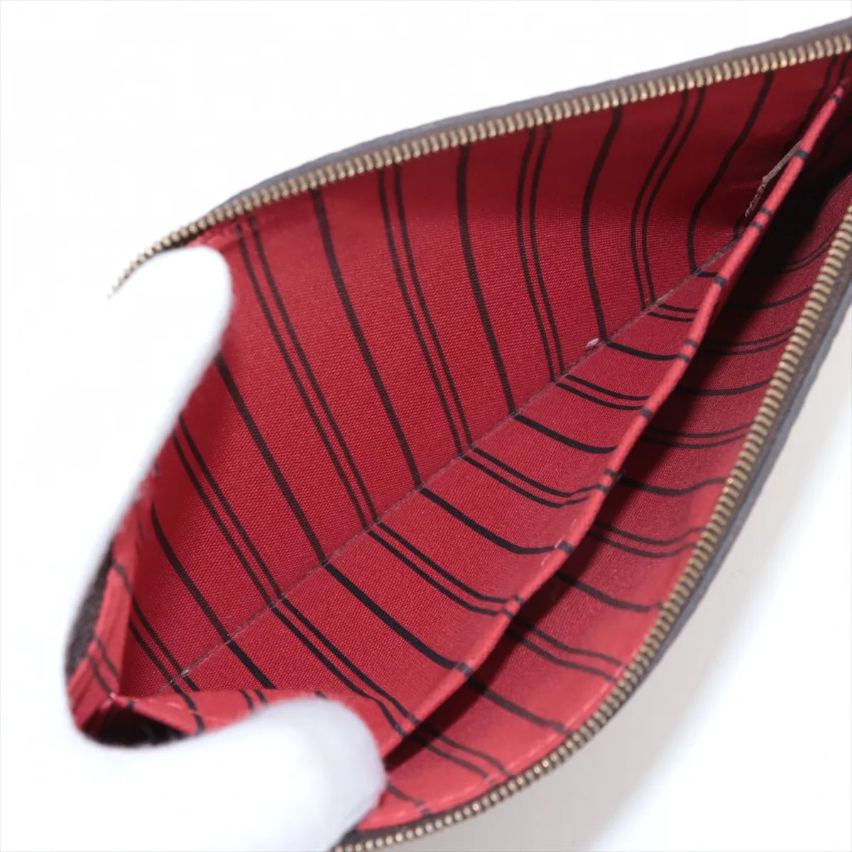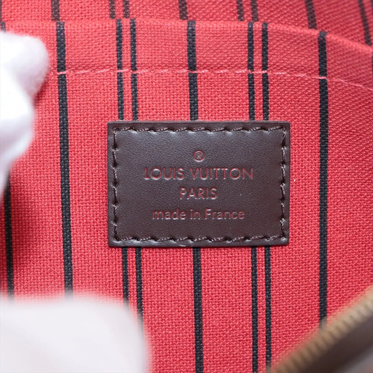 The Louis Vuitton Damier Ebene Neverfull GM Pouch Only is a versatile and stylish accessory designed to complement the iconic Neverfull GM bag or be used on its own. Crafted from classic Damier Ebene canvas, it features a spacious interior lined with a striking red stripe fabric, adding a pop of color and elegance. Compact yet practical, the pouch is perfect for organizing essentials such as cards, cosmetics, or small personal items, making it a functional and chic addition to any Louis Vuitton collection.