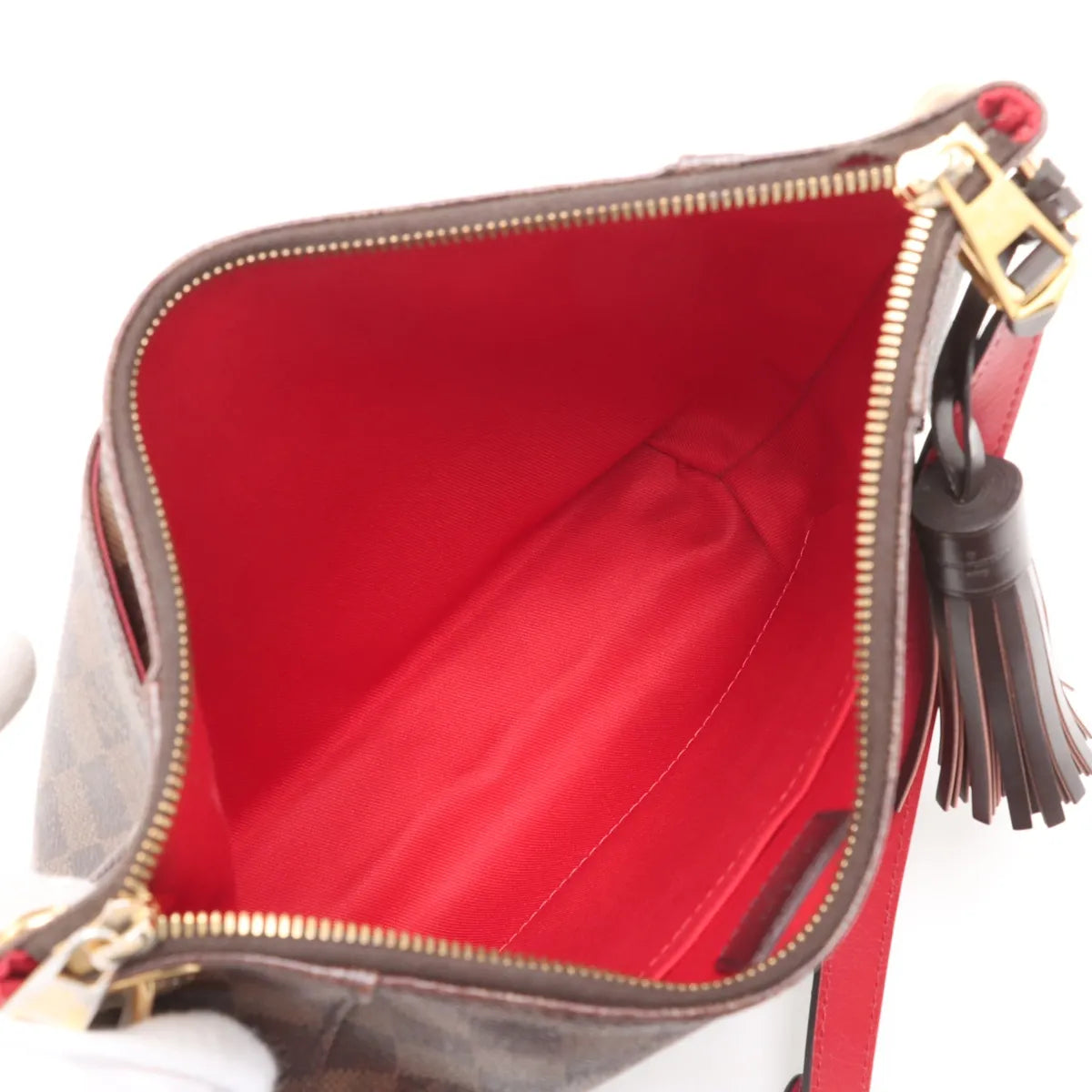 The Louis Vuitton Damier Ebene Southbank Shoulder Bag is a sleek and practical piece that combines classic design with everyday functionality. Crafted from the iconic Damier Ebene canvas, it features elegant gold-tone hardware that enhances its timeless appeal. The interior is spacious lined in vibrant red and includes a convenient slip pocket for organized storage, while an additional front slip pocket provides easy access to essentials.