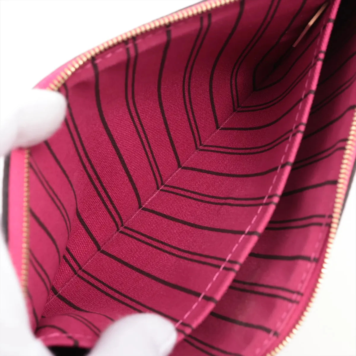 The Louis Vuitton Monogram Neverfull MM Pouch exudes timeless elegance and versatility. Crafted from the iconic Monogram coated canvas, the chic pouch features a sleek silhouette accented by natural cowhide leather trim and gold-tone hardware. The interior reveals a vibrant fuchsia striped lining, adding a bold and playful contrast to the classic exterior. Spacious enough to hold small essentials, it can be carried on its own as a clutch or used as an organizer inside a larger bag.