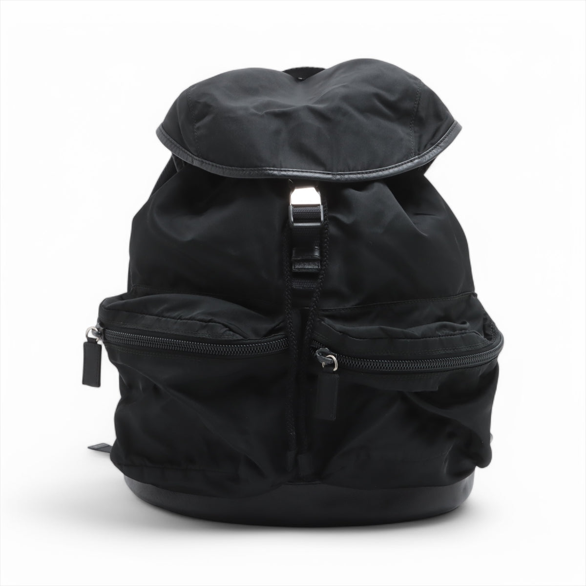 The Prada Tessuto Saffiano Nylon Leather Drawstring Backpack in black is a refined blend of functionality and luxury. Crafted from durable Tessuto nylon and accented with signature Saffiano leather trim, it features a drawstring closure beneath a flap secured by a buckle, ensuring both security and style. The backpack offers ample storage with dual exterior zip pockets at the front, while the interior includes a zip pocket for organization. Adjustable shoulder straps and a top handle provide versatile carrying options. Finished with silver-tone hardware and Prada's iconic triangle logo, the backpack embodies the brand's commitment to quality and design.