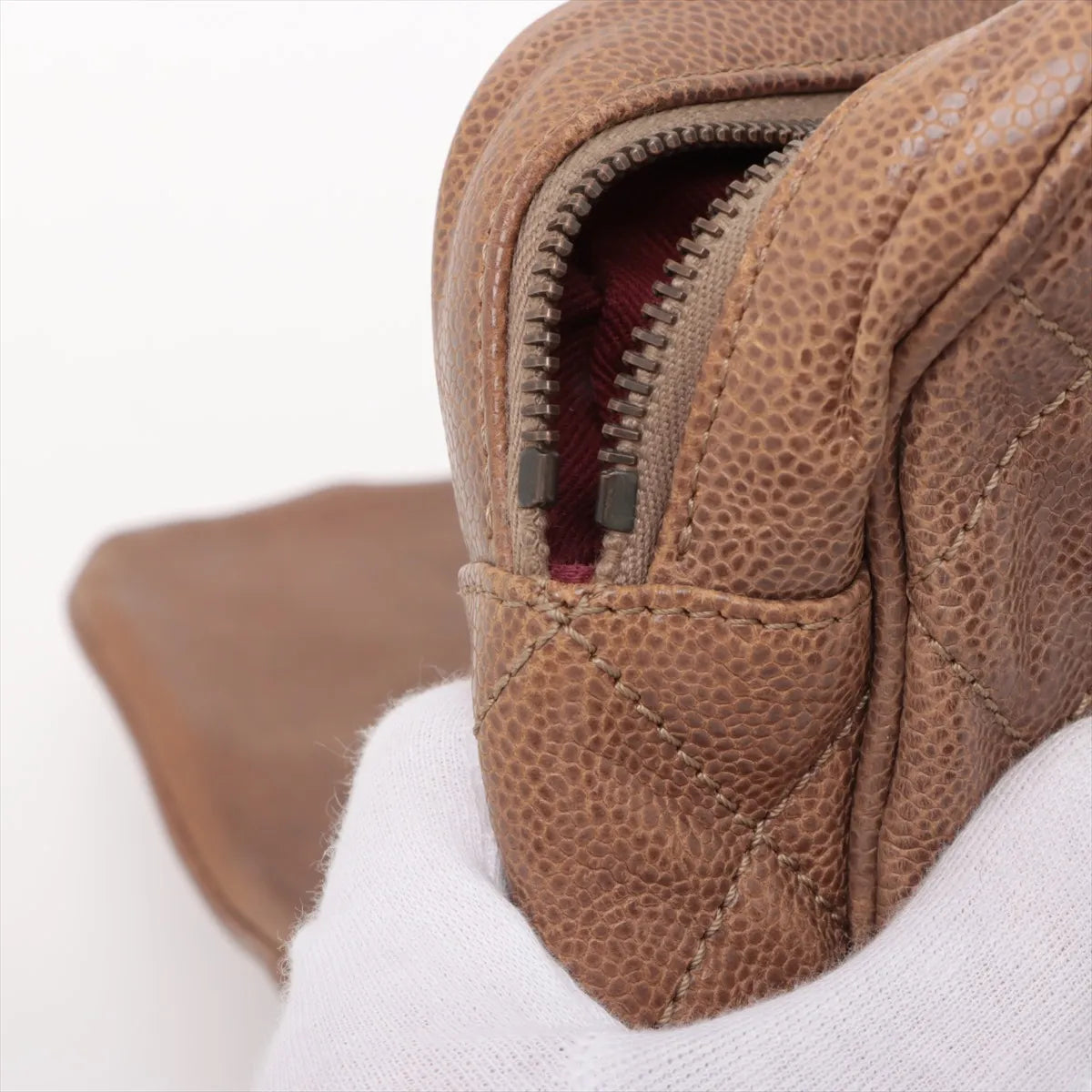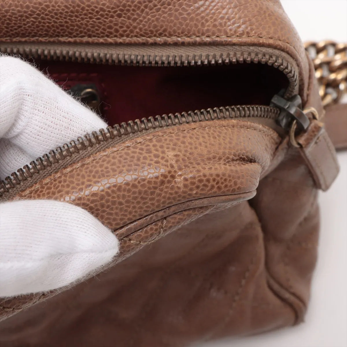 The Chanel CC Logo Matelassé Caviar Skin Single Flap Double Chain Bag in brown is a timeless expression of classic Chanel elegance. Crafted from durable quilted caviar leather, the iconic piece features a spacious interior designed to hold daily or evening essentials with ease. The interior includes both a slip pocket and a zip pocket for organized storage. Accented with polished gold-tone hardware, the bag is finished with an interwoven leather and double chain strap that allows for versatile shoulder or crossbody wear.