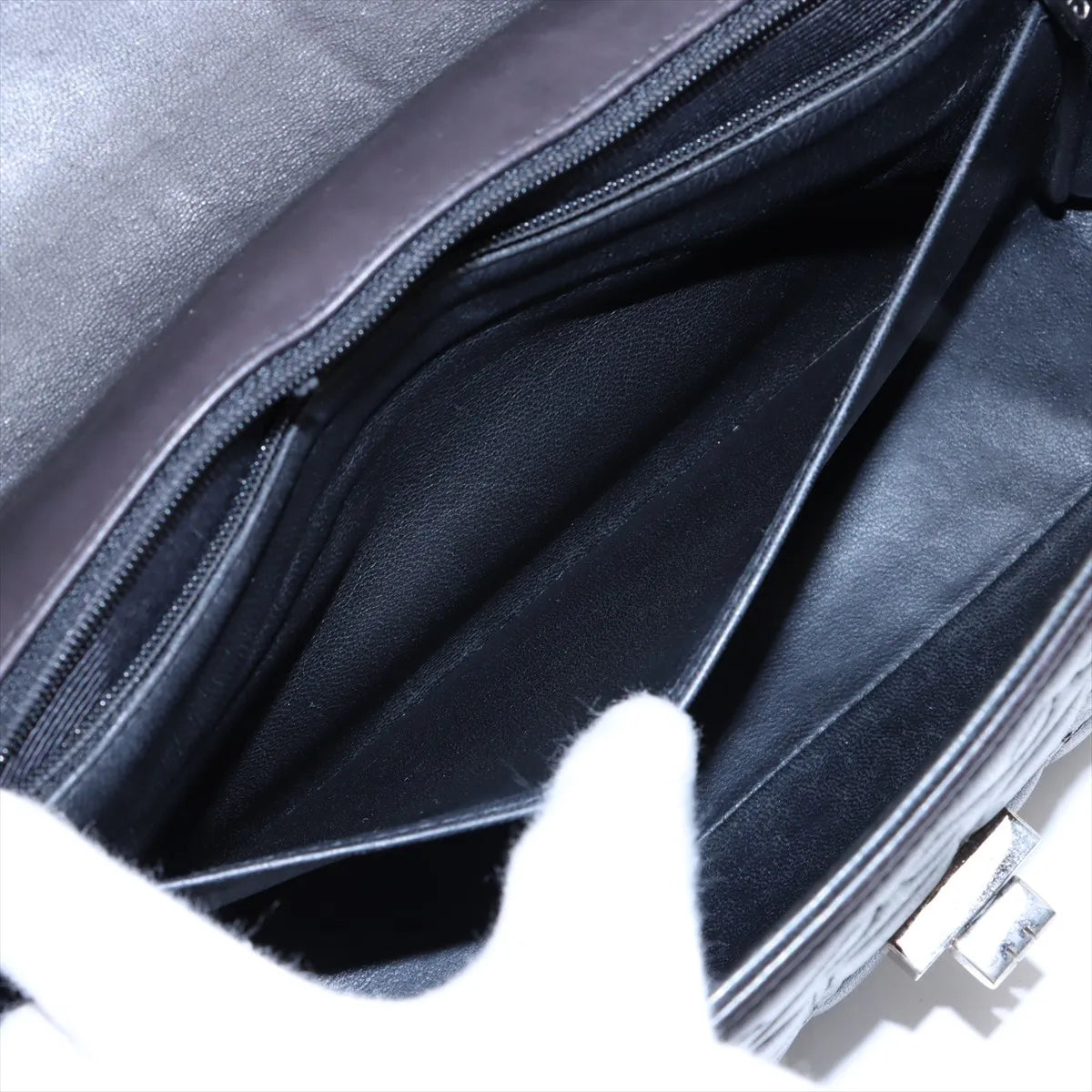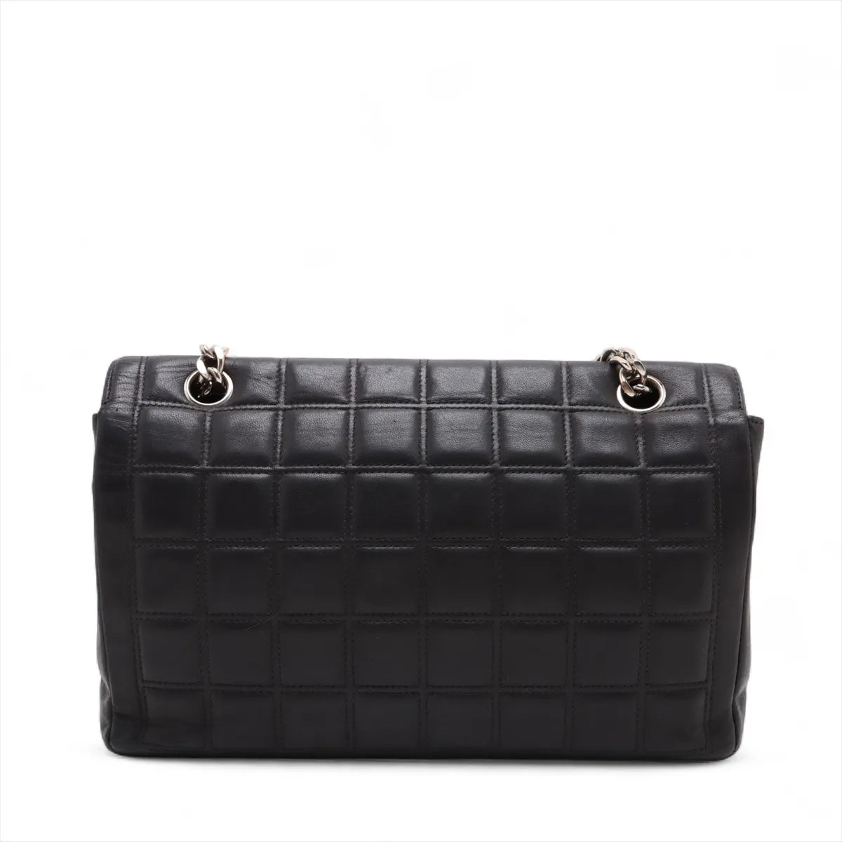 The Chanel Chocolate Bar 2.55 Lambskin Single Flap Double Chain Bag in Black is a refined statement piece that blends iconic design with elegant detailing. Crafted from luxurious lambskin leather, it features the distinctive chocolate bar–style quilting for a bold yet timeless look. The signature 2.55 twist-lock closure opens to a spacious interior thoughtfully designed with both slip and zip pockets for organized storage. Accented with polished silver-tone hardware, the bag is further elevated by CC logo details adorned with sparkling rhinestone studs on both sides, adding a subtle touch of glamour.