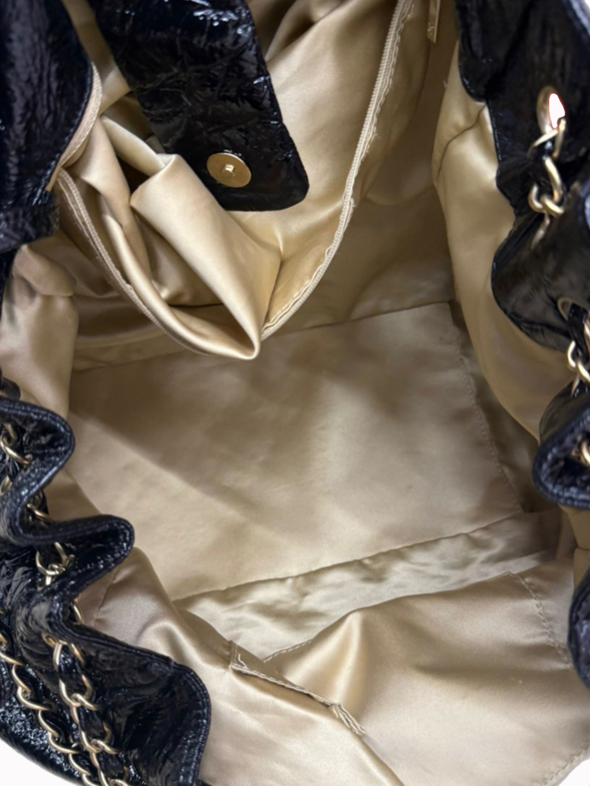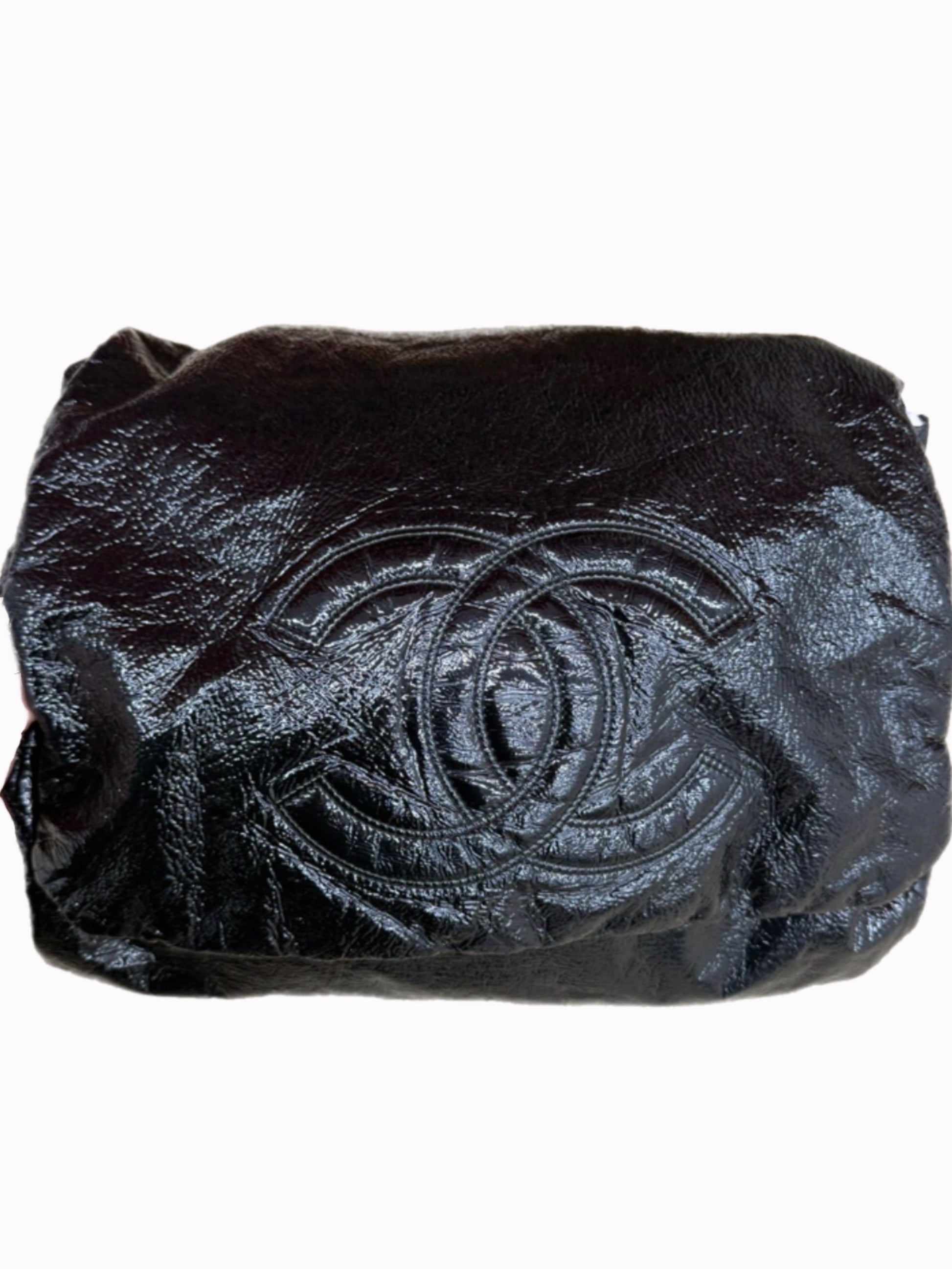 A bold and effortlessly chic Chanel hobo crafted from glossy black patent leather. The softly structured silhouette gives this bag its signature slouch, while the luminous patent finish catches the light for a sleek, modern look. An embossed interlocking CC logo anchors the design, adding understated brand recognition without overpowering the silhouette.