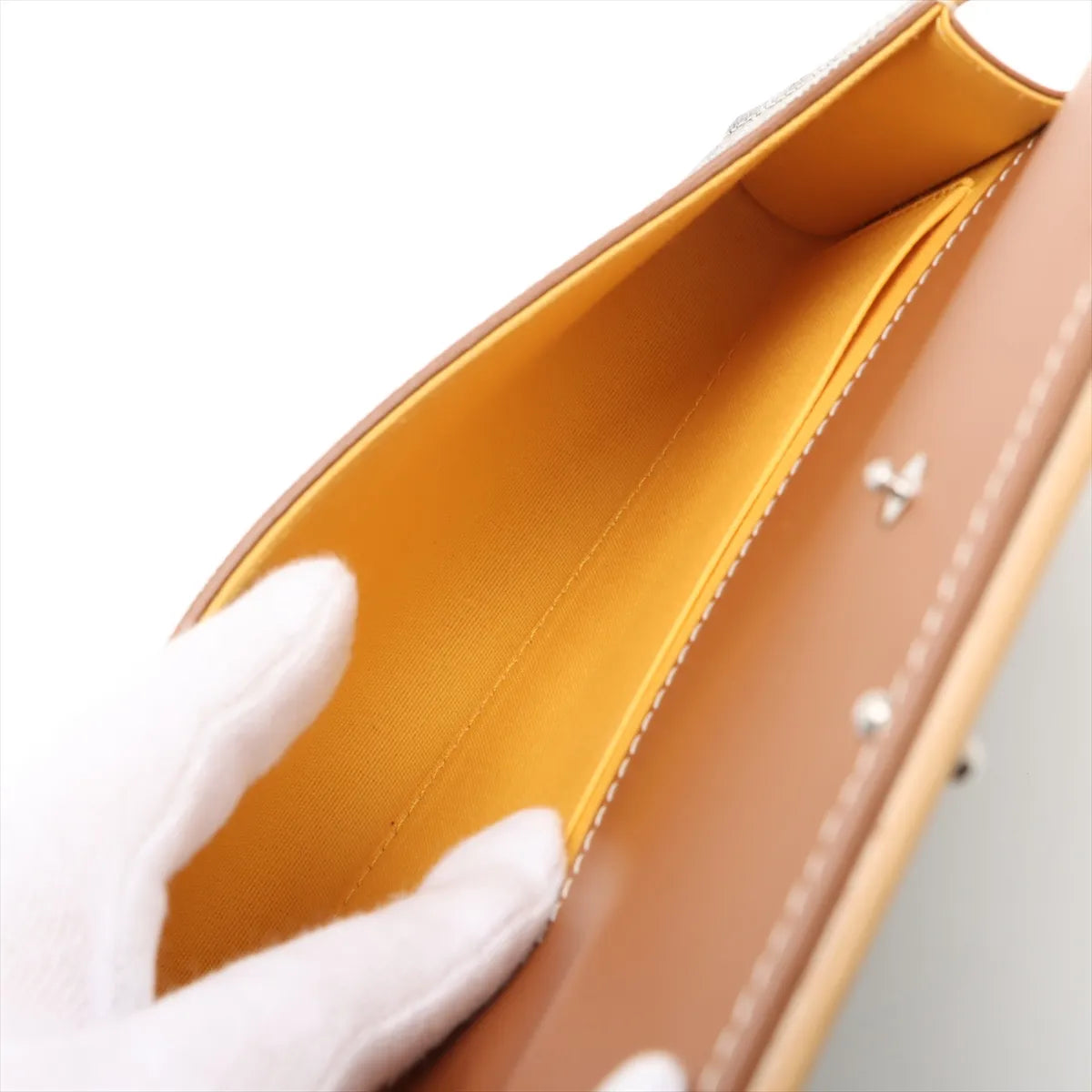 The Goyard Monte-Carlo Mini Case in Brown is a masterpiece of refined craftsmanship and timeless design. Made from the signature Goyardine canvas with smooth leather accents, it features elegant silver hardware and a distinctive leather wood plate design adorned with the iconic Goyard logo, showcasing the brand’s artisanal heritage. The case opens to reveal a spacious interior with a slip pocket inside, offering organized storage for small essentials.