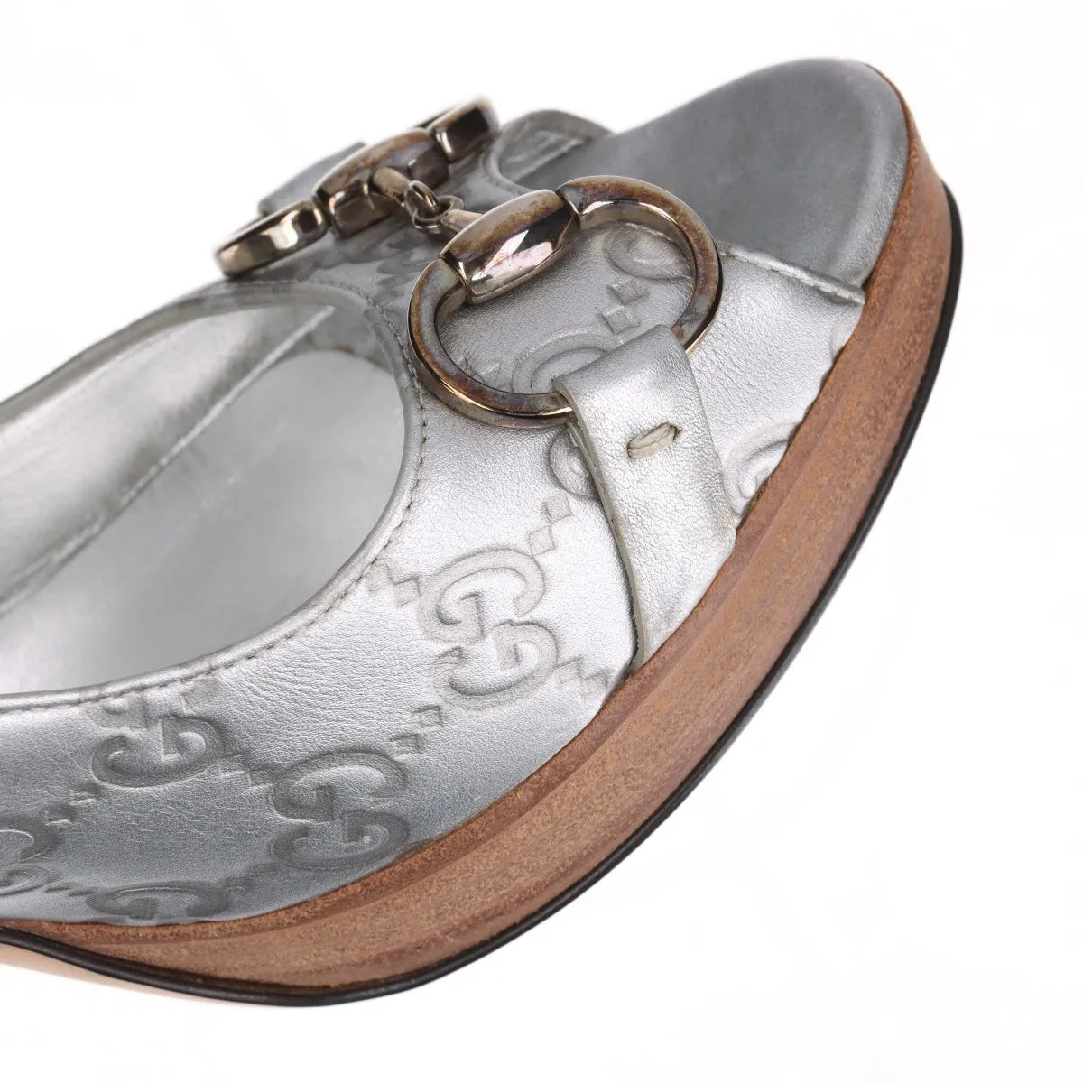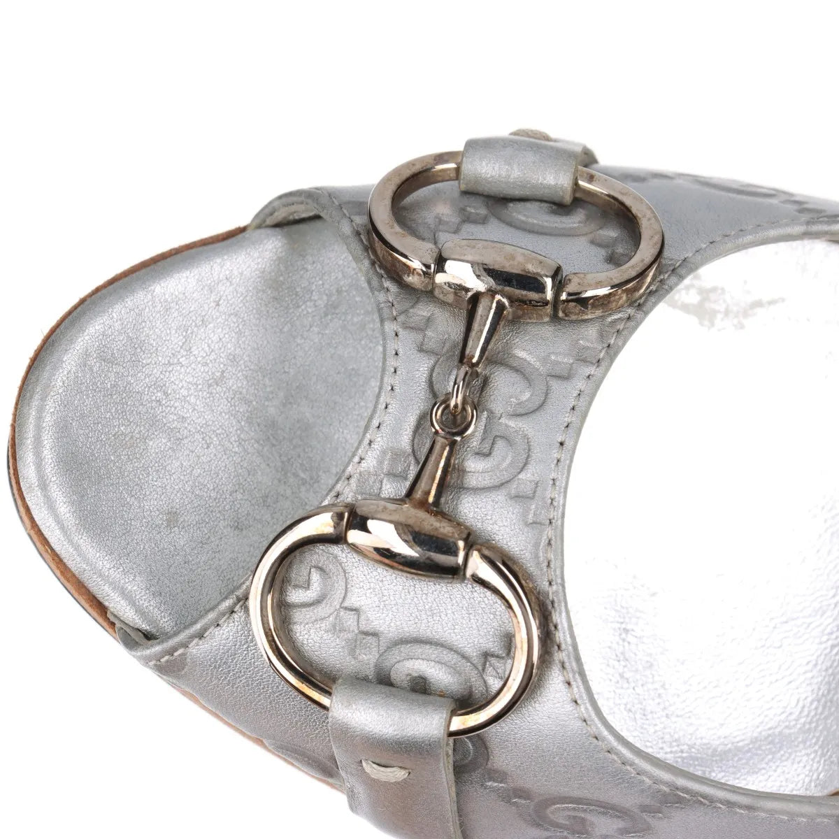 The Gucci GG Logo Open-toe Pumps in Silver combine timeless elegance with signature brand detailing. Crafted with a shimmering silver finish, the sophisticated pumps feature the iconic GG monogram pattern throughout, adding texture and unmistakable Gucci style. The classic horsebit detail adorns the front, highlighting the house’s heritage of refined craftsmanship.