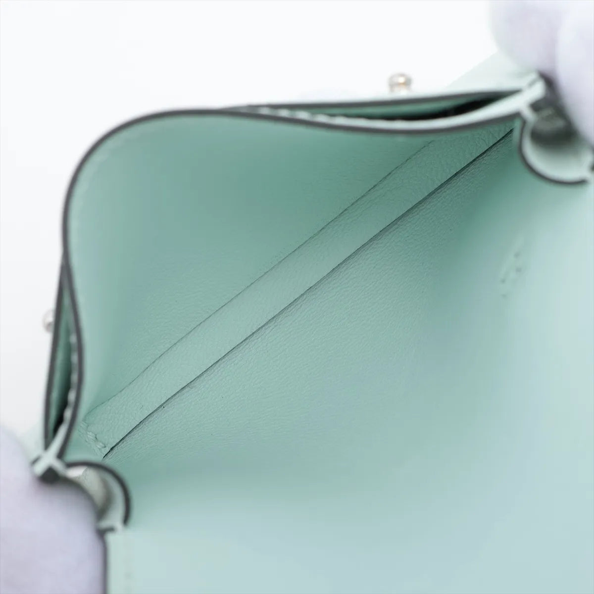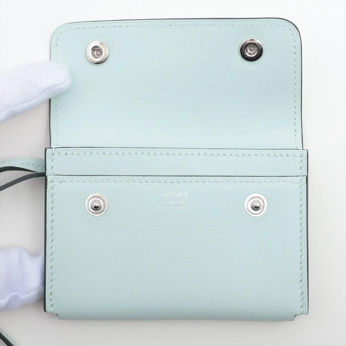 The Hermès Hermèsnap Card Holder in Vert Peppermint is a refined and contemporary accessory crafted from a luxurious combination of Togo and Swift leather. Designed with a surprisingly spacious interior for a compact piece, it features multiple slip pockets to neatly organize cards and small essentials. The flap is secured with two Hermès Paris snap-lock closures, adding both function and signature elegance.
