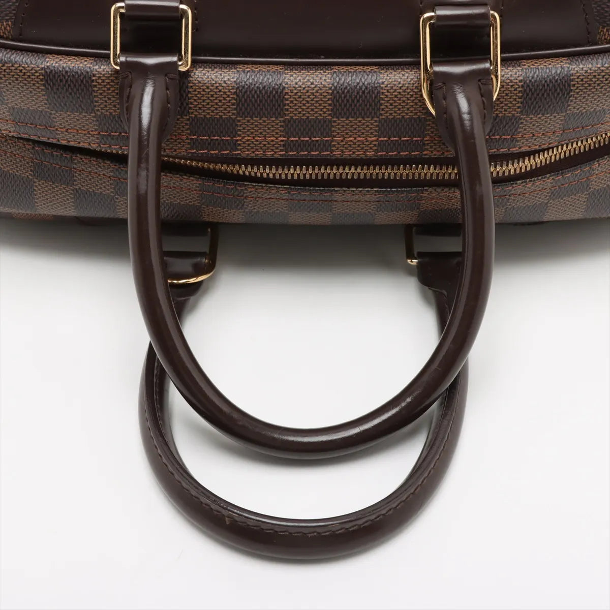 The Louis Vuitton Damier Ebene Deauville Handbag is a stylish and functional piece designed for everyday elegance. Crafted from the iconic Damier Ebene coated canvas with smooth leather trim, it features structured top handles for easy carrying and a secure double-zip closure. Accented with gold-tone hardware, the bag includes a key and padlock for added security and charm. Its spacious interior is lined with texture fabric and equipped with multiple slip pockets, making it ideal for organizing beauty essentials, travel items, or daily necessities.