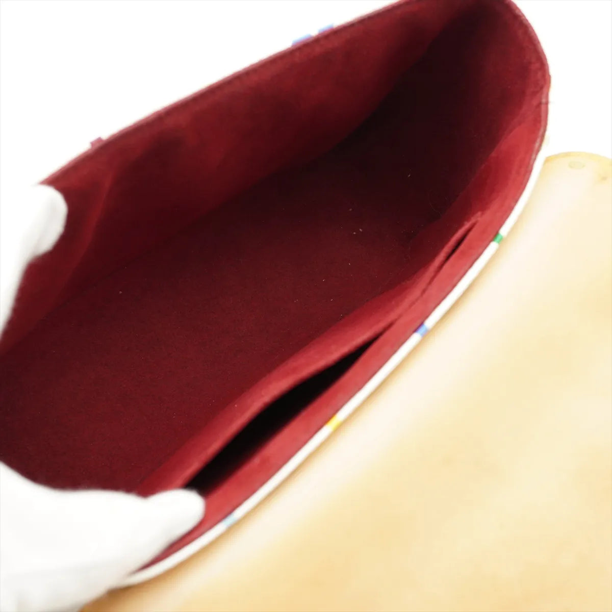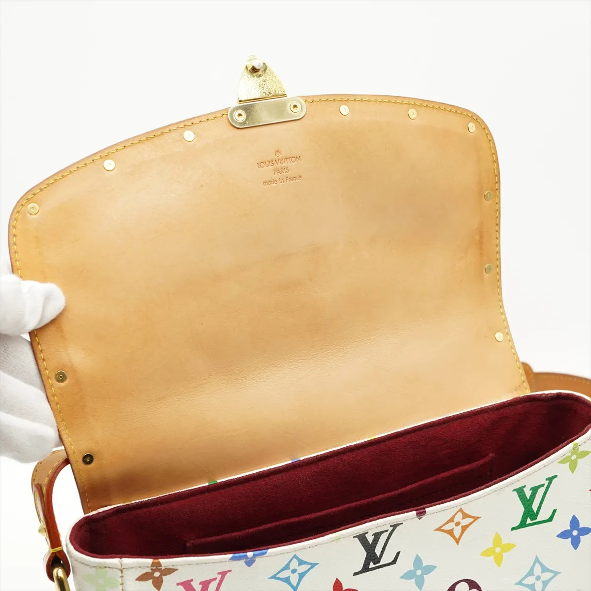 The Louis Vuitton x Murakami Monogram Multicolor Sologne in White is a vibrant and collectible piece that beautifully showcases the iconic collaboration’s playful and artistic design. Crafted from Multicolor Monogram canvas, it features a flap with an S-lock closure accented by small studs in front, adding a stylish and edgy touch. The interior is lined with rich red microfiber and offers a spacious compartment with a slip pocket for easy organization.